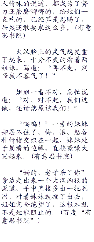 “喂你们两个,又在这个偷懒,赶紧做事情!”,一个大汉走过来吼道,双目不善的看着两姐妹。