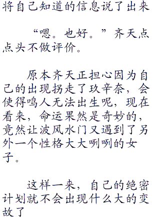 这一日,齐天正在家里和玲珑小夜谈情说爱,水心突然间进来汇报说三战结束了。从水心口中,齐天得知,波风水门在后来与雷之国的战斗中单挑战胜了云忍的ab组合,直接将云忍们打得龟缩了回去。