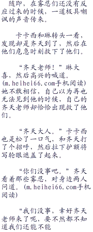 一道寒光闪过,卡卡西连忙拉着身后的琳闪躲开。却是一个雾忍在忍术泯灭的一刹那,在人的意识下意识的一松的时候,一刀刺了过来,幸好卡卡西此时还亮着写轮眼,提前发现并及时多了开。