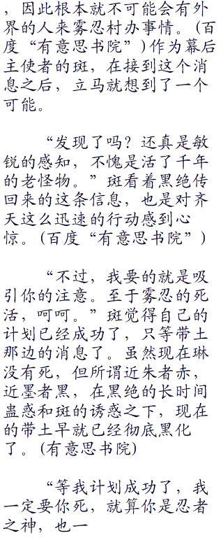 在几十年前,因为齐天恼怒于辉夜一族和水无月一族,对自己不老不死能力的觊觎,索性将这两族灭了族,因此,现在的雾忍村里拥有血继限界家族并没有原来那么多,但毕竟还是有的,因此雾忍的血雾政策终究还是在斑的操控下实行了。