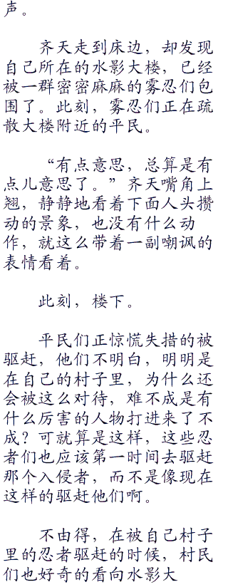 齐天摇摇头,对这种前仆后继的行为实在是感觉很无聊。这些雾忍在齐天看来都是一些小角色,就算是全杀光了,也没什么意义。齐天是带着另外的目的而来的,所以不想直接利用转生眼的能力去找矢仓,因为那样显得有些偷偷摸摸,有损他忍者之神的名声。