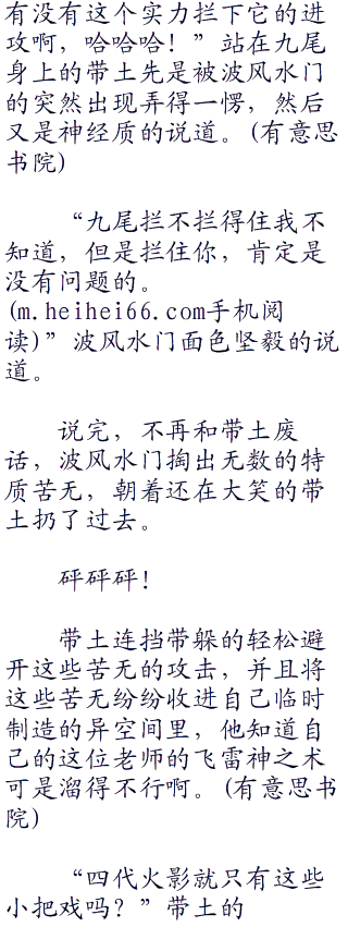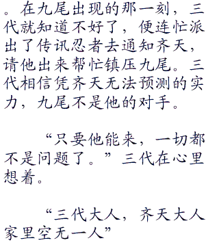 “去木叶。”带土对九尾下令道。然后,九尾庞大的火红色身躯立即在森林中奔跑跳跃这向木叶方向前进。