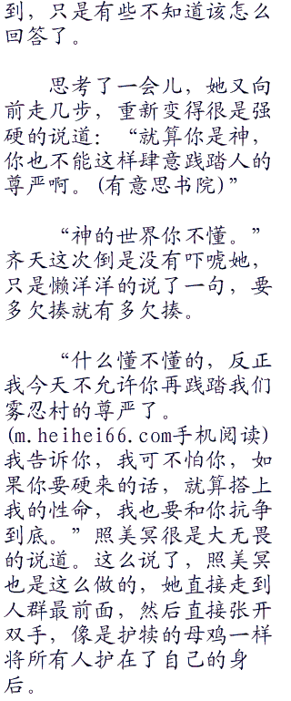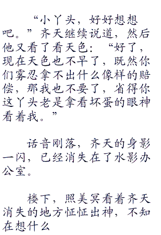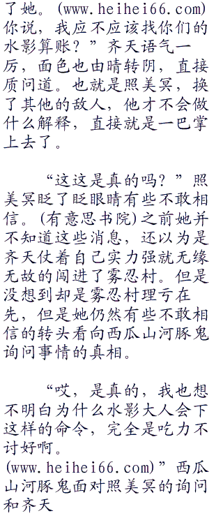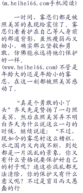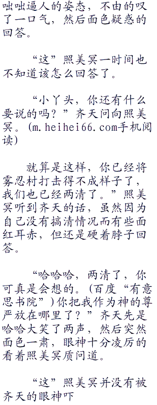 “而且,你看起来好像比我还小吧,真不知道你是怎么被称作忍者之神的,难道是你自封的?还有,你凭什么向我们雾忍村索要赔偿?在雾忍村打来打去的是你,说要找水影大人却打伤打死了我们这么多忍者的是你,而且你还破坏了这么多建筑,就连水影大楼都快要被打烂了,你凭什么还要索赔。”照美冥皱着眉头看了一眼四周凄凉的景象,然后转头看着齐天问道,话语间隐隐含着怒气。