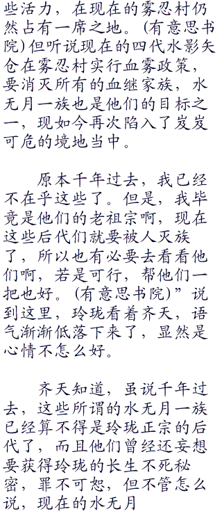 “是这样的。几十年前,那会儿夫君刚刚从冰封中苏醒,去水之国找我和小夜姐姐,因为恼怒于辉夜一族和水无月一族觊觎我们长生不死的秘密,所以将这两族的精英尽数灭杀,失去了族内精英的两族,从原本的水之国一流大族低落谷底。原本,因为已经是千年之后了,我也就没在乎家族不家族的,也就没有去管他们。但是,这几十年过去了,原本快要消亡的水无月一族貌似又有了一
