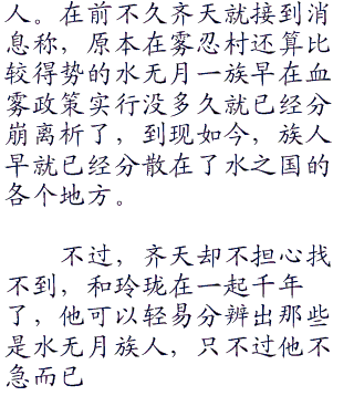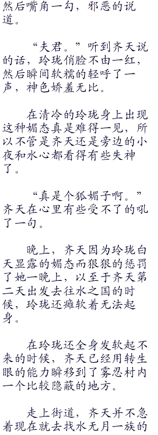 这天,齐天正在自己木叶的家里悠闲地喝着茶,一旁还有水心和小夜伺候着。感受着生活的平静,还有身边醉人的温柔乡,齐天感觉真是说不出的惬意。