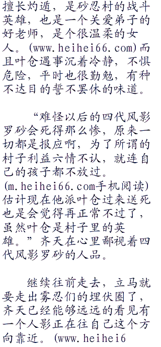 “对了,应该是砂忍村的人了。现在虽然三战结束了,但是砂忍和岩忍还是会经常爆发一些局部的战争,现在貌似隐隐有大决战的趋势。四代风影罗砂为了防止在他们砂忍和岩忍决战的时候被雾忍偷袭,就将叶仓作为政治牺牲品,以和谈的借口送到了雾忍境内。好像叶仓就是死在了雾忍境内,而且好像还死的挺惨的。”齐天终于想起了发生在这里的事情是怎么回事了,千年的时间让齐天很多事情都有些不太记得了。