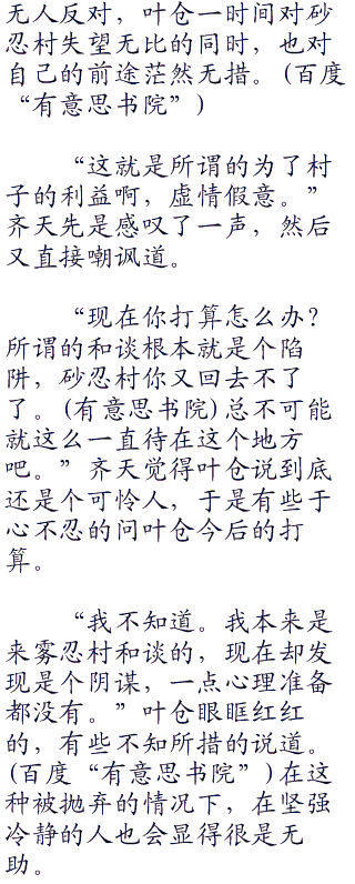 “不可能,四代大人说让我来雾忍是来和谈的。”听到齐天的话,叶仓大声的辩驳,她不相信自己为砂忍村贡献了那么多,罗砂会如此绝情的对待她。