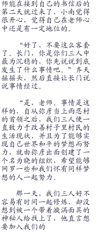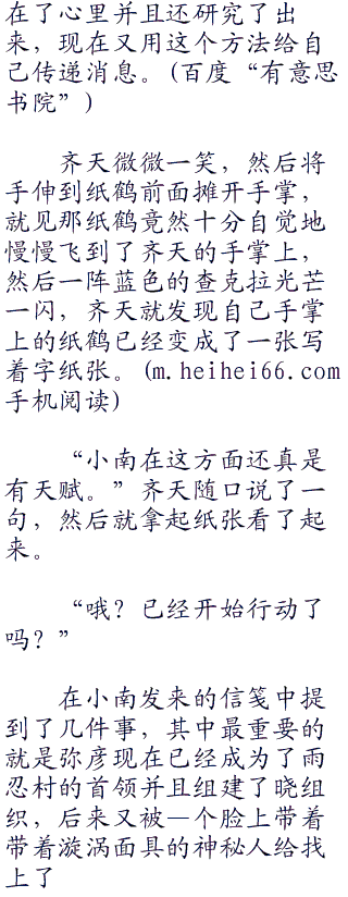 齐天还记得,那时候自己在雨之国内和小南一起在街上走着,因为小南觉得自己的纸遁没有什么太大的用途而心情有些低落,所以齐天便好好的安慰了一下她。后来齐天又想起自己还在天朝的时候看神话故事里老是出现的纸鹤,便顺带一提,本来是想转移小南的注意力的,没想到小南还真的记