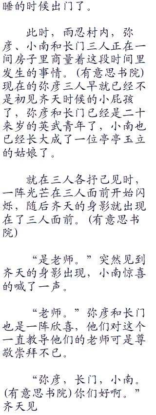 在结束了这件事情之后,齐天也是再一次空闲了下来。闲来无事,齐天也会到处走走,或是去涡潮村见见水户,或是去鬼之国找已经把自己看成齐天女人的弥勒。