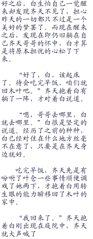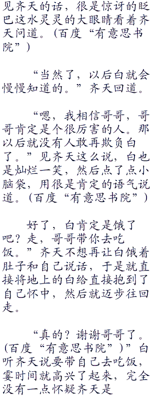 “哥哥叫齐天,白要记住了。以后若是谁想要欺负白的话,白就告诉他们哥哥的名字,他们就不敢欺负你了。”齐天笑了笑,然后回答道。
