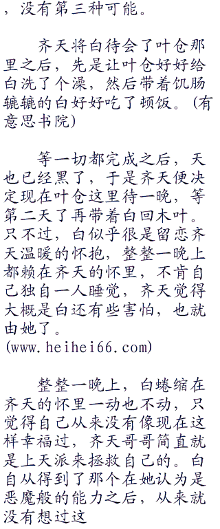 这一瞬间,白感觉到了一阵前所未有的温暖,她感觉自己面前这个哥哥的手好温暖,就像是很久以前之前自己母亲的手一样,充满着温暖,可是自从自己突然有了那个恐怖的能力之后,就再也没有感受过了。这一刻,白真想一辈子都能这样就好。