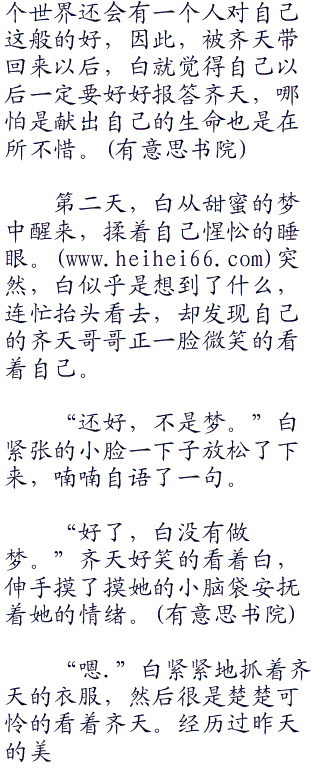 “白可不脏,在我看来,白是这个世界上最干净的人了。”齐天听到白的话,感到一阵心酸的同时,露出了一个灿烂的笑容,如同冬日里的太阳,让白感觉自己原本冰冷的身体一下子暖和了起来。