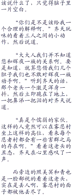 老头躬着身子低着头,不敢再说什么了,一副诚惶诚恐的表情。老头以为齐天虽然人狂得没边,实力也强得没边,但是对雾忍村发生的事情应该不是很了解才对,老头觉得