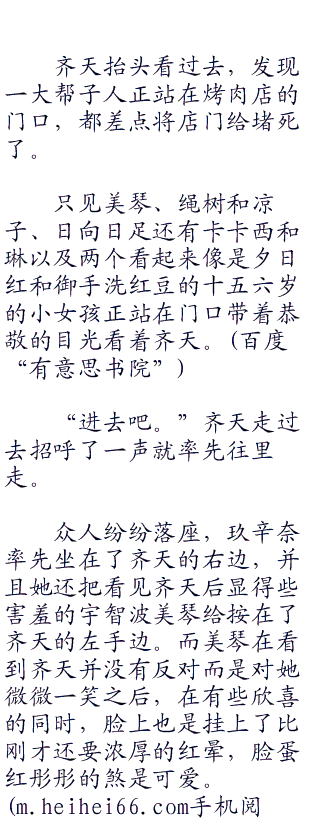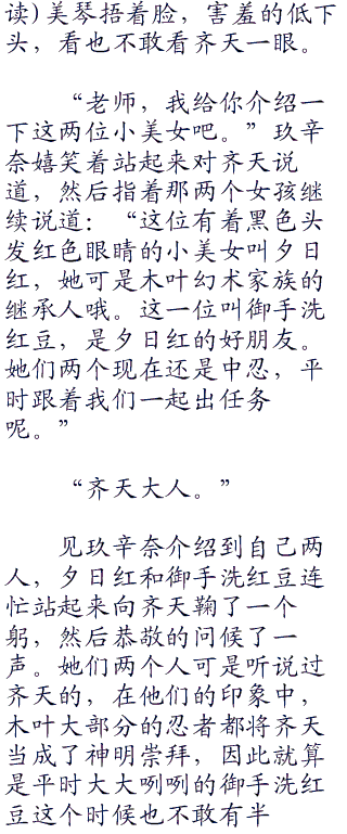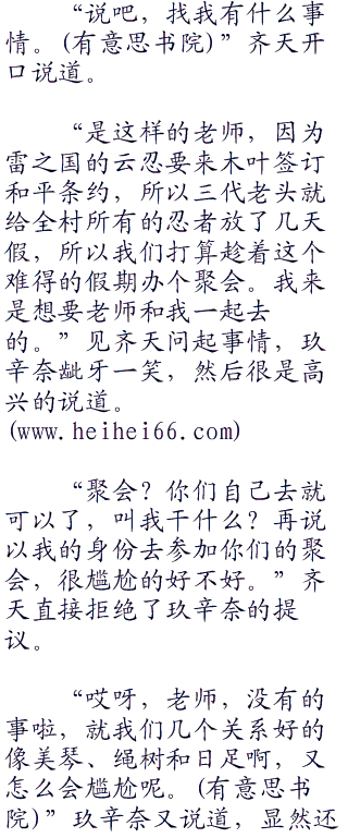 这天,齐天正独自一人坐在庭院中悠闲的享受着午后的时光的时候,就看见玖辛奈风风火火的跑了进来。