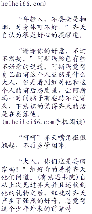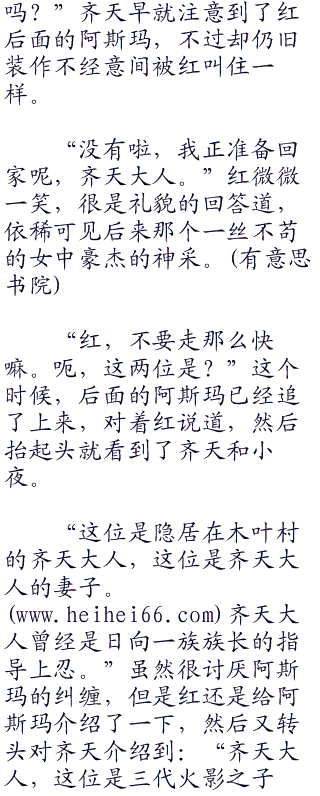 “呵呵,鸣人,这位哥哥叫齐天,我叫小夜。”小夜微笑着弯腰摸了摸鸣人的头说道:“天色已经不早了,鸣人赶紧回家睡觉去吧。”