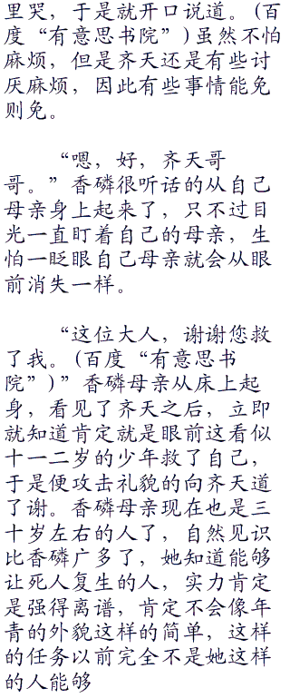 “妈妈原本已经死了的,是齐天哥哥给妈妈治好了伤,然后又救活了妈妈的。”香磷一边哭泣一边讲事情大概的讲给了自己的母亲。