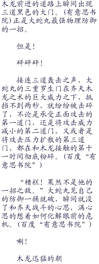 见万蛇这个体型巨大的敌人不见了,木龙瞬间掉转过巨大的身子,朝着另一个敌人大蛇丸奔过去了。