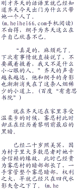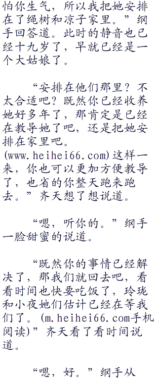 纲手低着脑袋,看也不敢看齐天,都快要将脑袋埋进她自己一直以来引以为傲的凶器里面了。现在的纲手就如同一个做错事情的小孩子等着大人的批评一般,一点也没有外人眼中木叶公主应该有的气势,这要是让那些崇拜她的木叶忍者们看见了,绝对会惊得直接将下巴扔到地上上。