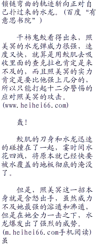 而正被围攻的干柿鬼鲛面对这么多攻击却依然不惧,脸上带着轻蔑的神色看着周围的暗部上忍们,手中鲛肌时不时的挥舞几下,或是挡住偷袭的武器,或是直接将水遁忍术里面的查克拉给直接吸收走让其变成普通的水流失去攻击力。