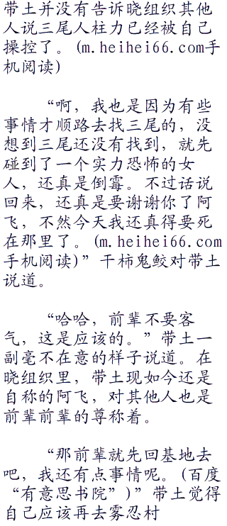 “我说,前辈你没事去水之国抓什么三尾啊。老大不是说了吗,五大忍村的人柱力先不要动,我们还没有实力对他们下手。”带土看着干柿鬼鲛疑惑的说道。