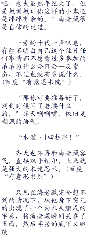 往日里,一直身居高位的海老藏碰到的忍者哪一个不是因为他的身份和实力对他恭恭敬敬的,何时被别人这么无礼的顶撞和打断说话过。所以,陡然间出现了齐天这么个态度和其他忍者完全相反的人,海老藏脑子一时间没转过这个弯来,就开始抽起了风来。