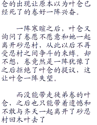 同时,千代又想起了三代风影莫名其妙的失踪,以及她最爱的孙子突然的叛变,这些都让千代有些唏嘘不已。