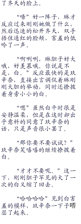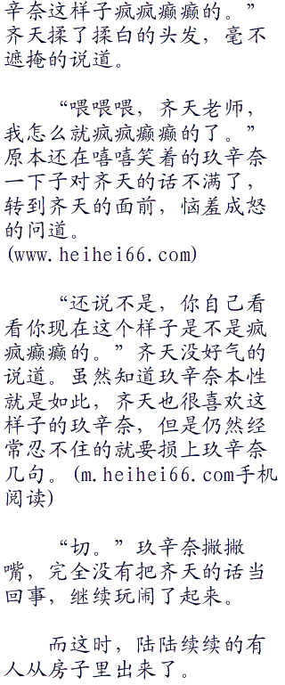 刚刚回到家,齐天还来不及开口说话,就看见漩涡玖辛奈正一边咧着嘴大笑着,一边疯疯癫癫的围着白在闹腾着。