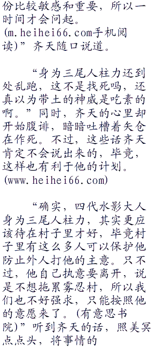 “好啦,你在想什么我都知道啦。”照美冥瞬间会过意来,很是亲昵的挽过齐天的手臂撒起了娇。齐天是什么人,照美冥知道得一清二楚,自然不会拼着让齐天厌恶来将齐天绑在雾忍村的战车上,何况她也不想这么做。