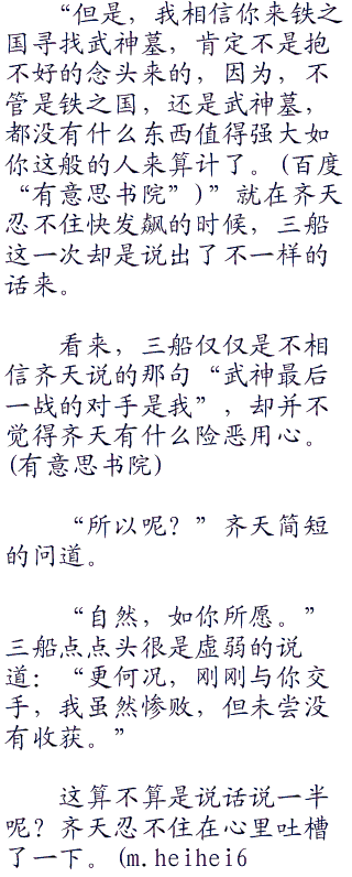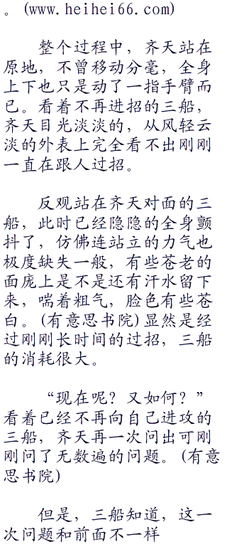 到如今,三船已经不是单纯的防备齐天有什么阴谋企图了,而是如同一个武痴一般一遍一遍的和齐天交手,不肯认输,即使三船知道自己已经输了。