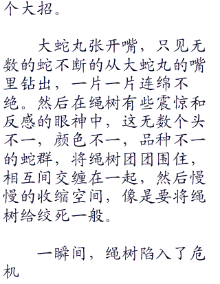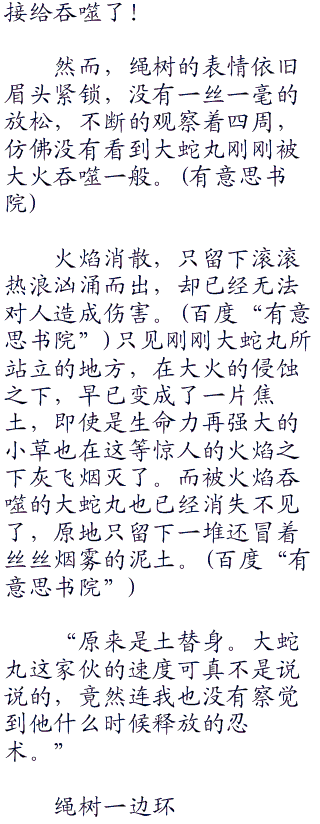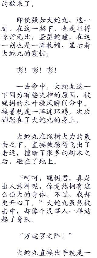大蛇丸抬起一只手对绳树一挥,就看见数条大蛇从他的袖口中激射而出,吐着红色的信子,迅捷的扑向绳树。