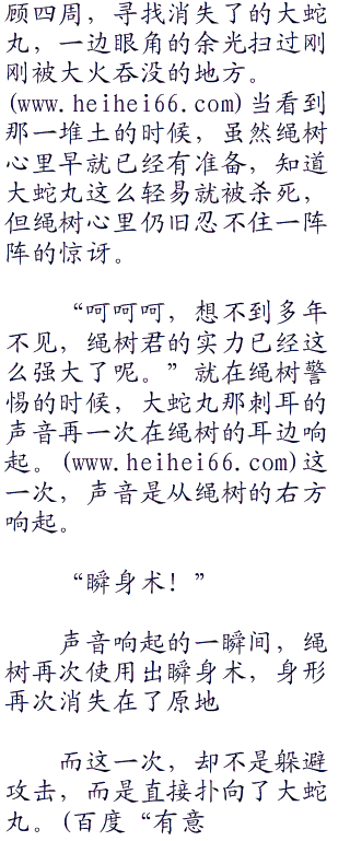 眼看去群蛇已经到了近前,绳树下意识的就用瞬身术躲开了。早就已经是上忍的绳树,很早之前就能很流畅的使用瞬身术了,而且随着这些年的成长,这些技能对他来说,已经像是印在了骨子里一般。