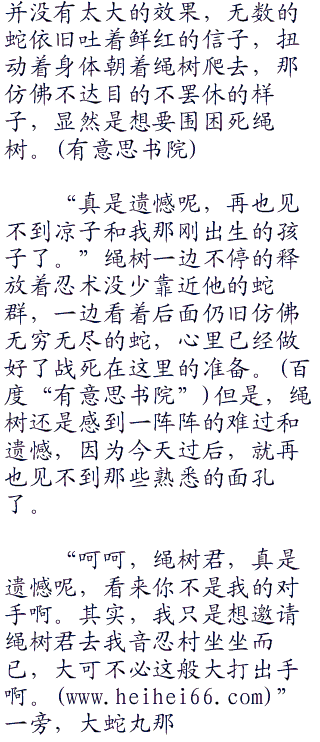 但是,虽然绳树的忍术威力很强,杀伤力也很大,对蛇群造成了大量的伤亡,但是与现场成片成片的蛇的数量比起来,