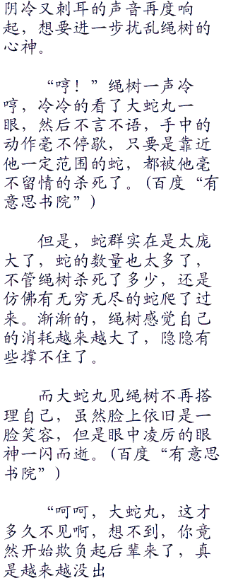 绳树心里一紧,想不到大蛇丸这一招这么凶险。