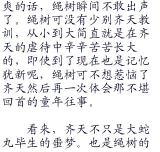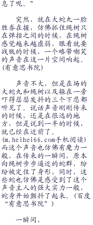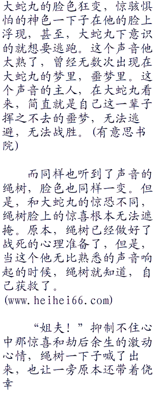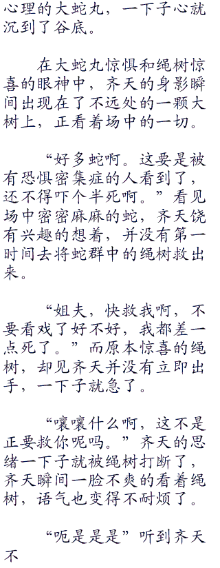绳树看了前后左右,发现毫无空隙,怎么也躲不过去,又看了看上空,绳树想要从上面躲避这一杀招。可是,绳树却发现自己头顶上方,不知何时,也出现了一大群的蛇在遮天蔽日般的树梢上盘桓着,只要绳树从上方突围,这些蛇肯定会在绳树跳起来没有着力点的时候狠狠的咬他一口。