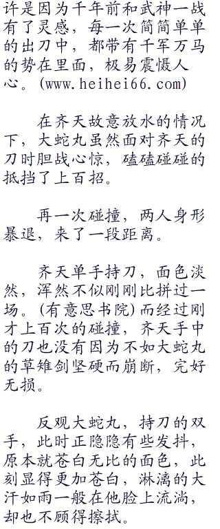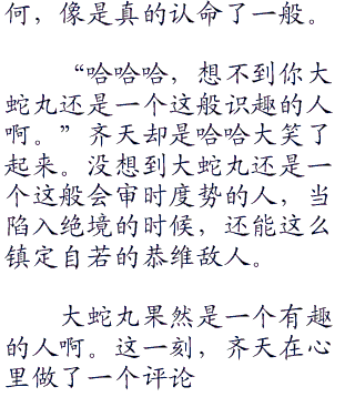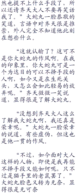 两人甫以交手,便一触即分。却是因为大蛇丸受不住齐天巨大的力道,被震退了十来步,每退一步,便在地上留下一个深深的脚印。