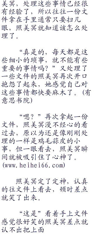 “这样下去什么时候是个头啊。我还这么年轻,难道就真的要困在这间办公室里面吗?”信手翻着桌子上的一份文件,照美冥一边漫不经心的看着,一边抱怨着自己灰暗的人生。