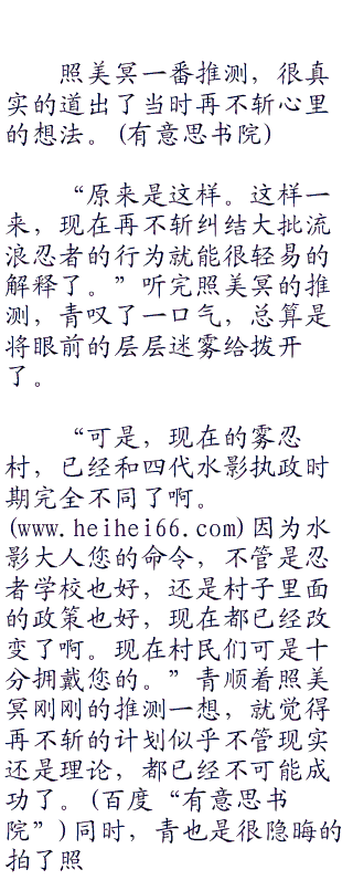 说到一半,青的话就打住了。青觉得,自己接下来的话对四代水影有一定的诋毁性。