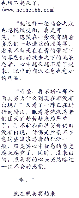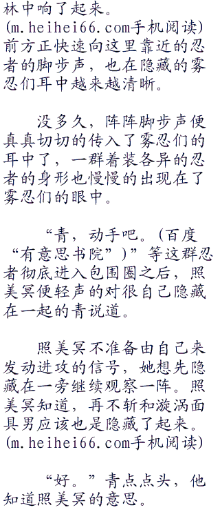 没多久,得到照美冥的命令的雾忍们,迅速停下前进的脚步,然后各自散开,展开身法各自隐藏了起来。