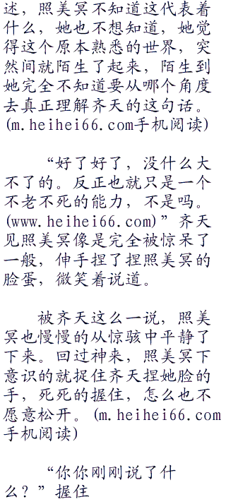 听到齐天这貌似随意的吐露出的惊天秘闻,照美冥只感觉自己头皮发麻,全身僵硬,肌肉紧紧的绷着,一动也不能动了。脑海中划过一道闪电,然后便是一声惊天巨响,照美冥脑子嗡嗡作响,这震耳欲聋的惊世之言,让照美冥再也无法正常思考了。