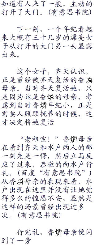 而村民们见到齐天和水户肩并肩走在一起,纷纷露出惊讶的神色。虽然村民们看着齐天的样貌觉得似曾相识,但没有任何一个人将齐天和村子里的神庙中那常常接受他们跪拜的那个人联系在一起。