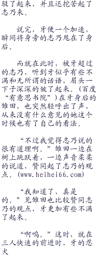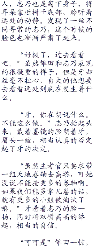 雏田三人在森林之中开始跑跳了起来,在一棵棵的大树上不断的辗转腾挪着。与先前的小心翼翼相比,现在的三人要迅捷多了。