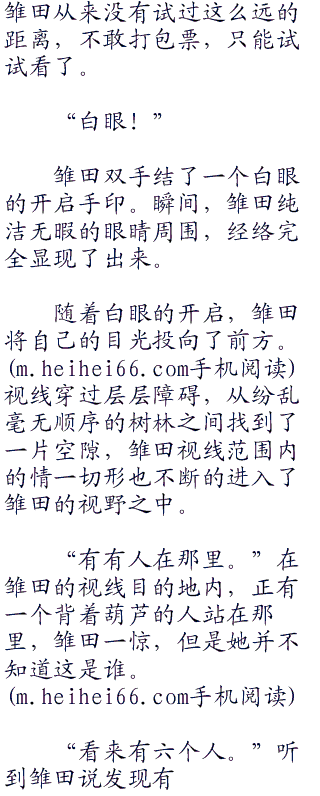 齐天就身处在雏田旁边不足三米的地方,在雏田三人毫无察觉的情况下,三人在明,一人在暗,开始前进了。