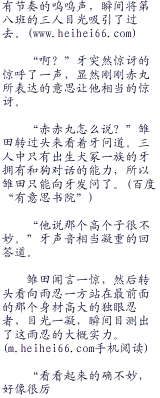 “赤丸能凭借嗅到的敌方查克拉来判断敌人的强弱。但是,我第一次看它怕成这样。看来,在前面交手的家伙,不是等闲之辈。”牙先是解释了一下赤丸的一些能力,然后看着怀中害怕得呜咽着的赤丸感到一阵心疼,伸手摸了摸赤丸发抖的身子。