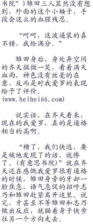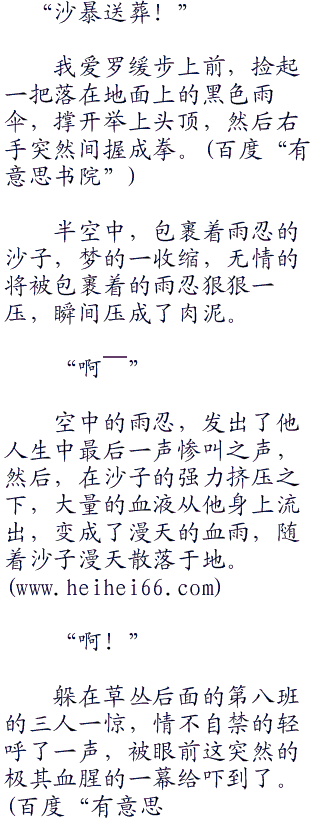 “千针雨啊”身处沙壳内的我爱罗,突然脑袋微微一低,然后阴森的看着对面的雨忍,相当血腥的说道:“那我就来一场血雨吧。”