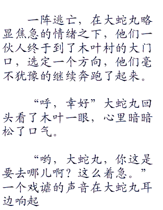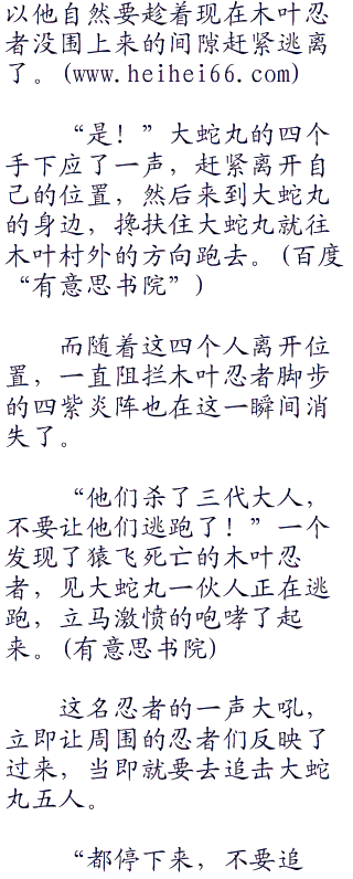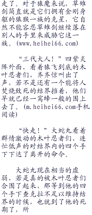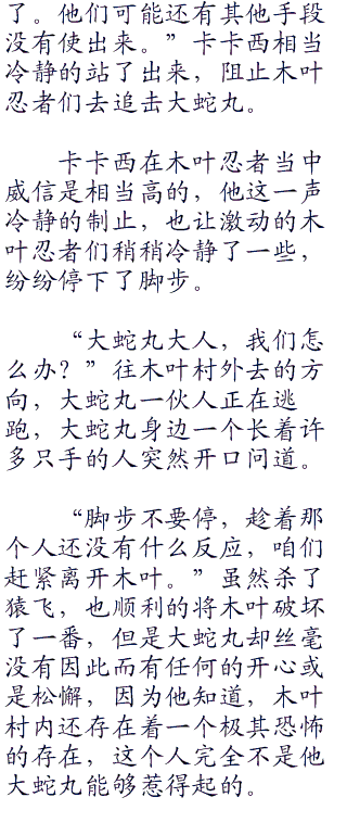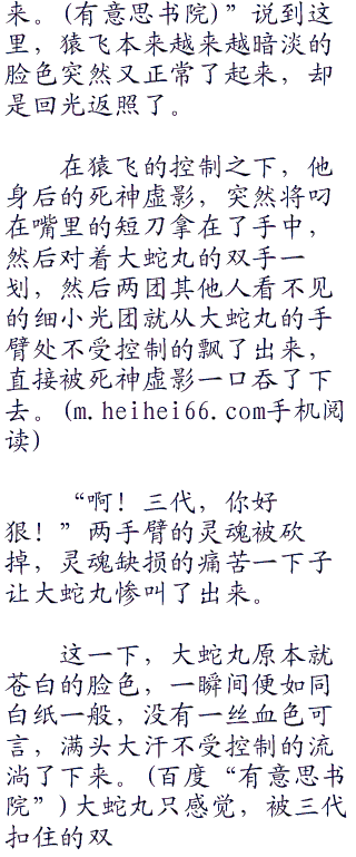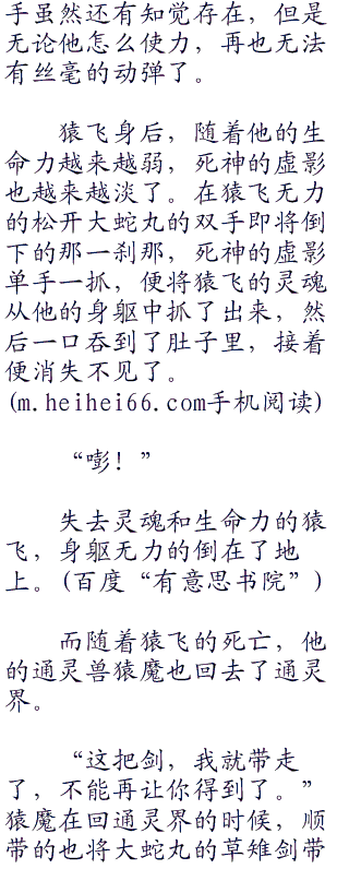 “看来,我是没有办法将你带走了。”猿飞嘴里不断的流淌出深红的鲜血,一边喘着粗气有些不甘心的对大蛇丸说着话,一边扣着大蛇丸的双手不断的用力。