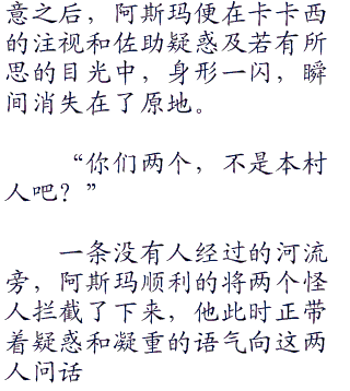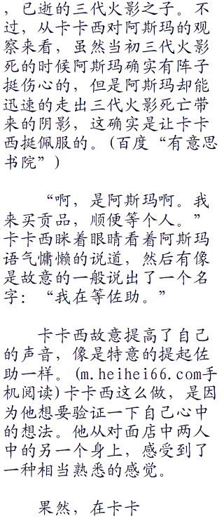 卡卡西看在眼中,只觉得这两个人相当的怪异。卡卡西可以肯定,这两个人绝对是外来者,因为在今天之前,他并没有在村内见过有这种打扮的人出没。并且,卡卡西还能从这两个人的身上,感受到一股强烈的危险气息,让卡卡西的心里不由自主的产生一个念头,那就是他有可能不是这两个人的对手。