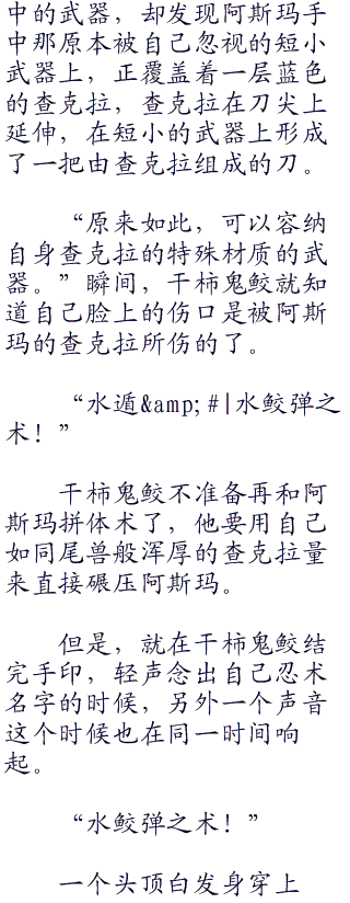这个时候的阿斯玛,因为不太了解干柿鬼鲛的招式和能力,在刚刚和干柿鬼鲛的硬拼过程中,被干柿鬼鲛手中的鲛肌在左手臂膀处拉出了一条深深的口子,此时伤口处仍旧还在流着鲜血。