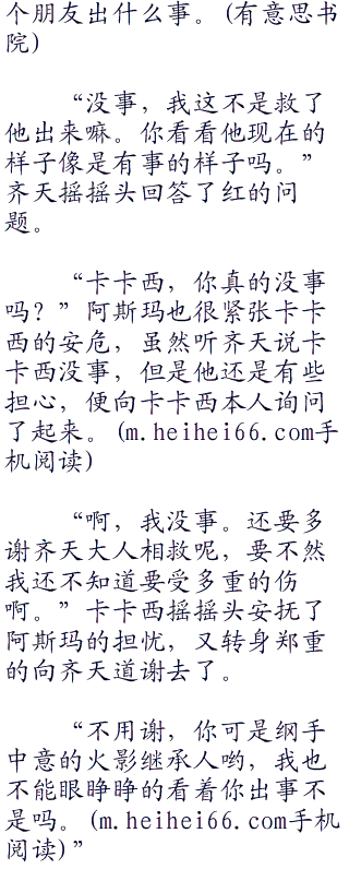 “那那卡卡西没事吧?”红听齐天说卡卡西中了幻术,不由得脸色一变,赶紧向齐天问道。毕竟和卡卡西也是同一个村子的忍者,平时关系也算不错,红也不希望这么