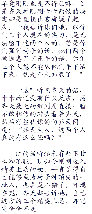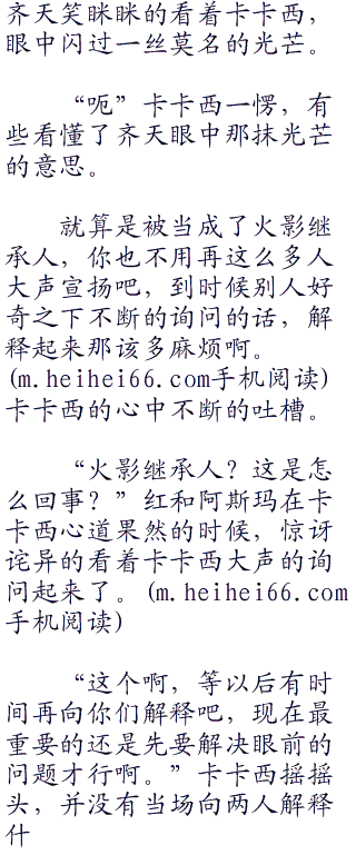 齐天走到卡卡西三人身后几米的地方便停下了脚步,开口叫了一声前方因为卡卡西的提醒还在紧紧闭着双眼的红。
