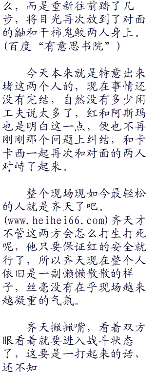 “啊?”红听到声音一愣,还以为她闭眼不及时中了幻术呢。但是,红听到这个熟悉的声音的时候,虽然心中有些忐忑,但还是下意识的转头往身后看了看,瞬间便惊讶的叫出了声:“齐天大人!你怎么来了?”